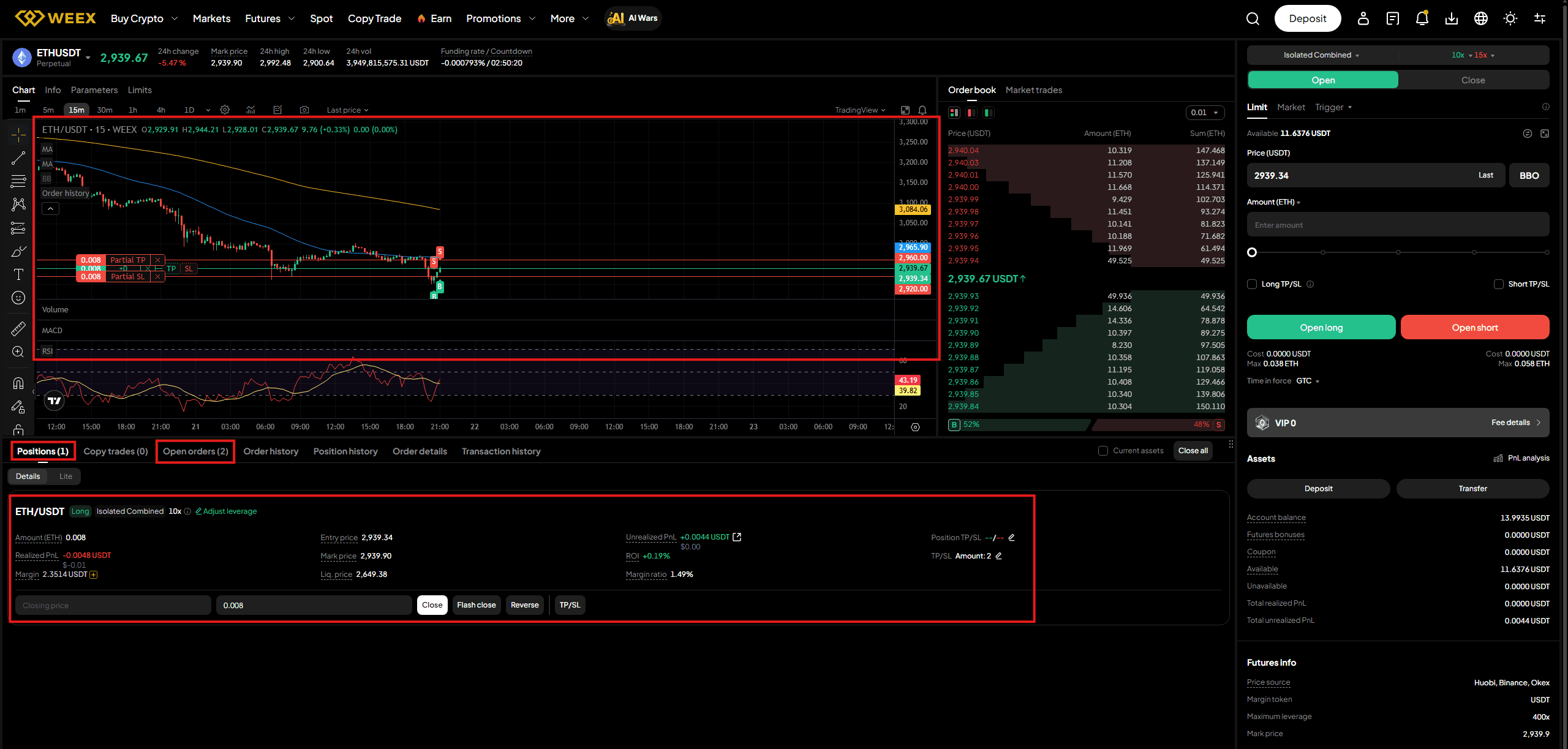 Select the Futures pair you want to trade on the top left side of the page. Use the Price Chart to identify potential trading setups based on your patterns or any other technical indicator on WEEX Futures. The Order Book ,on the right, shows the Bids (buy orders) marked in green, starting with the highest price. While Asks (sell orders) show what sellers want, the lowest price first. This real-time list of demand and supply determines the market price, with the difference between the highest bid and lowest ask called the spread.